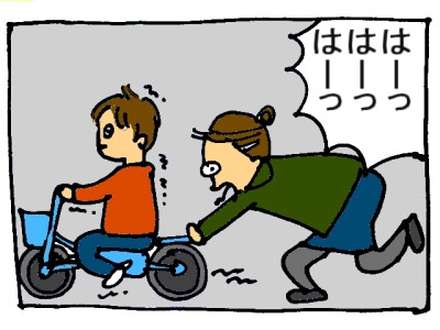 しかし、怖がりの長男、練習といっても、実際はひたすら私が後ろを固定して中腰で走るという、部活並にハードなもの。