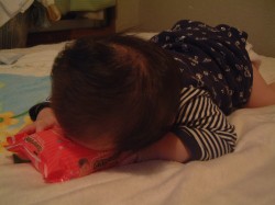 破水後は急に子宮口が開いて、分娩室で助産師さんたちが慌てて点滴をさしたりしながら「てきとうにいきんでて」といわれ、てきとうに2回ほどいきんだら頭が出てきて、「つるっ、ぽん!」と生まれました。足にはかせてくれる青いカバーもかたっぽしか間に合わず、出産。