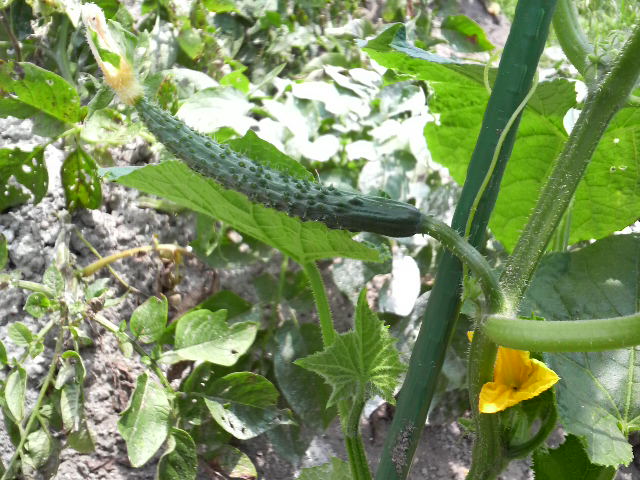 ネットで「ズッキーニは地を這って育つ」とかいてあったのを信じて、キュウリの苗も地を這わせていたものですから、それがキュウリとわかってからあわてて支柱を立て、寝ている茎を引っ張り起こし、むりやり支柱にくくりつけました。