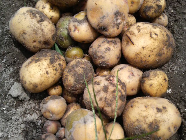 普通、じゃがいもは花が咲いて枯れてきた頃収穫時期だそうで、私のは花も咲けずに枯れてきたのでだいぶ早めの収穫ですが、まあうちで食べるには困らない量がとれそうです。