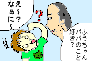 だいたい、1才過ぎから「ママママ」ってなるのがフツウの子だけど、うちは全く、ママじゃなきゃいやなんてことはおろか、「あれ、いたの」ぐらいなドライな対応だったもので、3歳にして今更「ママがいい」と言われたのがよほどパパにはセンセーショナル?な出来事だったようで。