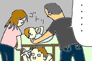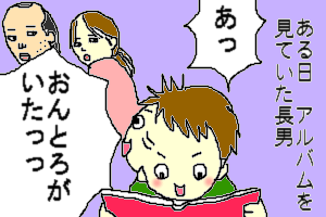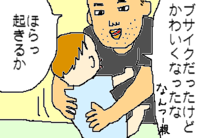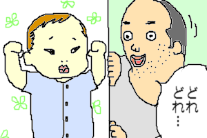 何というか、もっさりしたおっさんとおっさんのような乳飲み子が無言で微笑みあっているさまが、なんとも平和だったのと、現場の絵ヅラが面白かったので採用してみました。