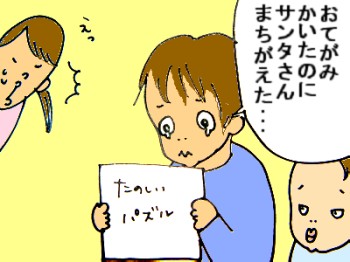 ある日保育園でのクリスマス会で、サンタに扮した市の職員から、全員に配られたプレゼントを持ち帰り、いそいそと開けたふう。
