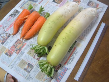 よく遊ぶママ友のなかに、無農薬野菜を注文して取り寄せて食べてるセレブなママが3人いるんだが、たまにパート先の水菜とかほうれん草を持っていくと喜んでくれるので、このだいこんとにんじんも(自慢がてら)おすそわけした。